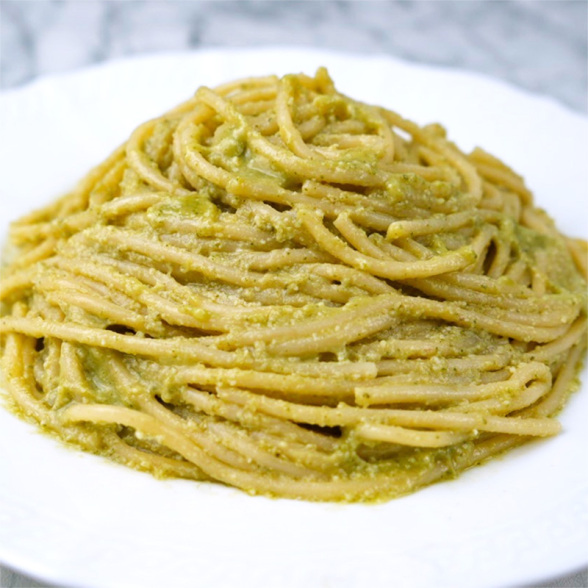 松の実を弱火で焦がさないように丁寧にローストし香りを引き出し、オリーブオイル、バジルペースト、クリームを加え、パルメザンチーズ、にんにくをミキサーにかけて滑らかなジェノベーゼソースに仕上げました。 コクがあり彩り豊かなソースです。
